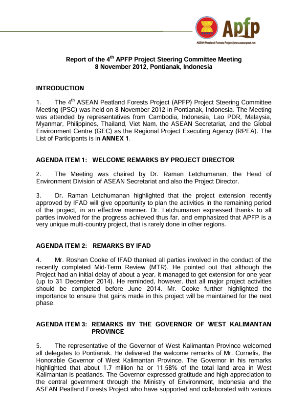 Minutes of Meeting, Peat Materials Report of the 4th APFP Project Steering Committee Meeting in Pontianak, Indonesia (8 Nov 2012) Download