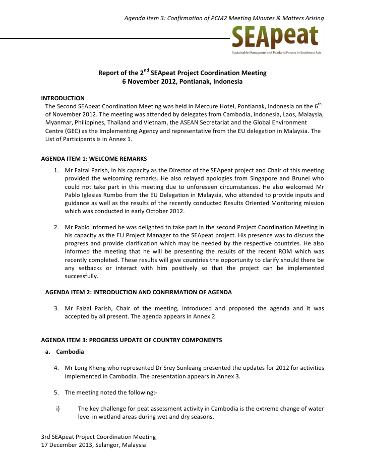 Minutes of Meeting, Peat Materials Report of the 2nd SEApeat Project Coordination Meeting in Pontianak, Indonesia (6th Nov 2012) Download