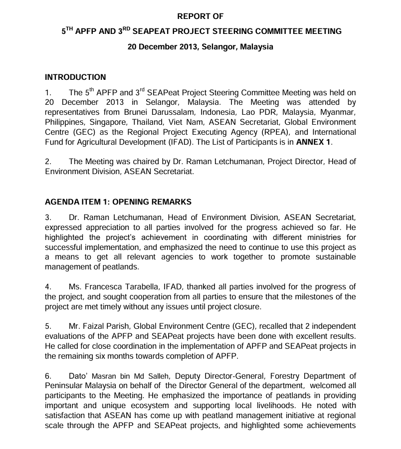 Minutes of Meeting, Peat Materials Report of 5TH APFP and 3RD SEAPeat Project Steering Committee Meeting (20 Dec 2013) Download