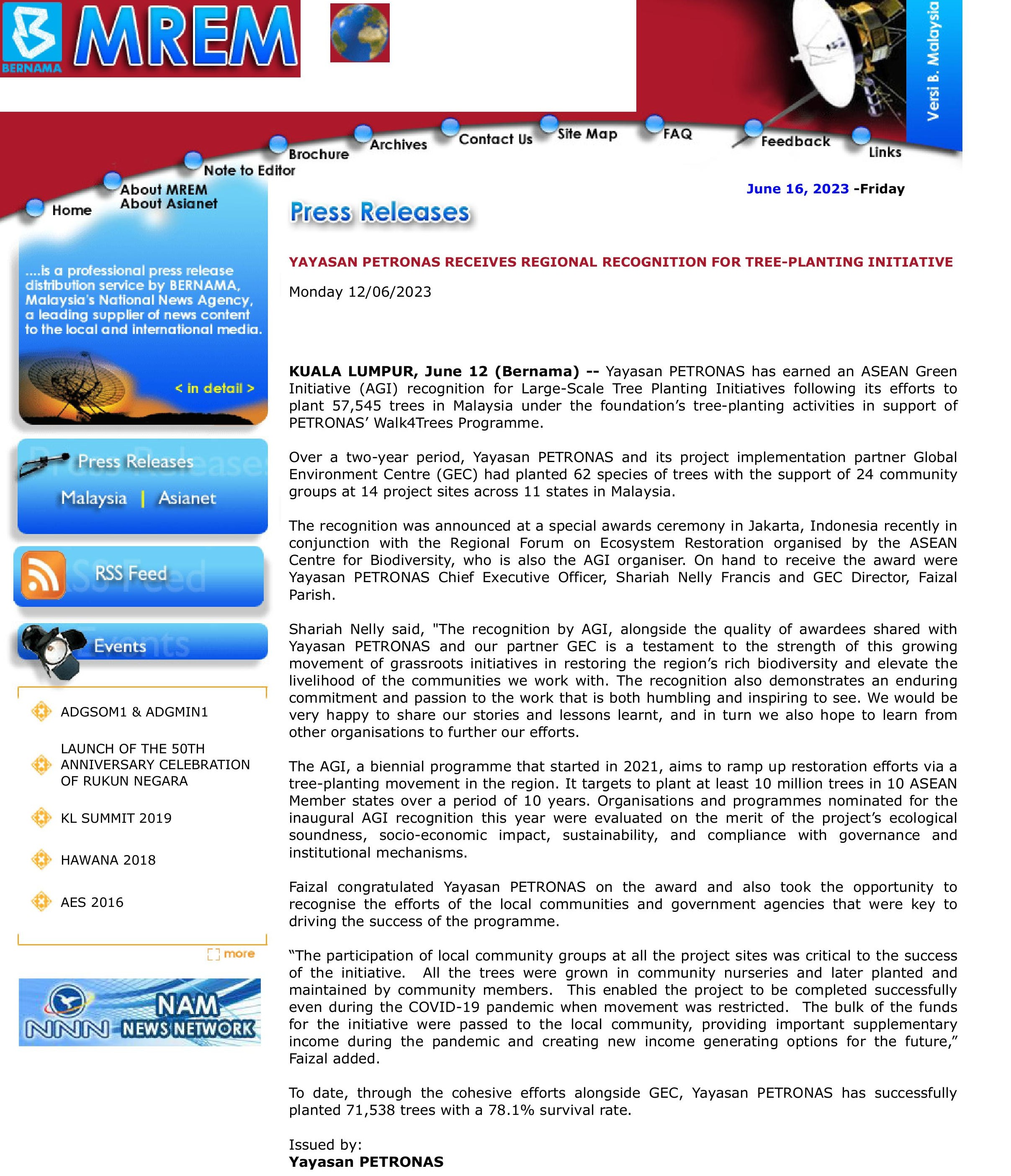 Yayasan PETRONAS Receives Regional Recognition For Tree-Planting Initiative